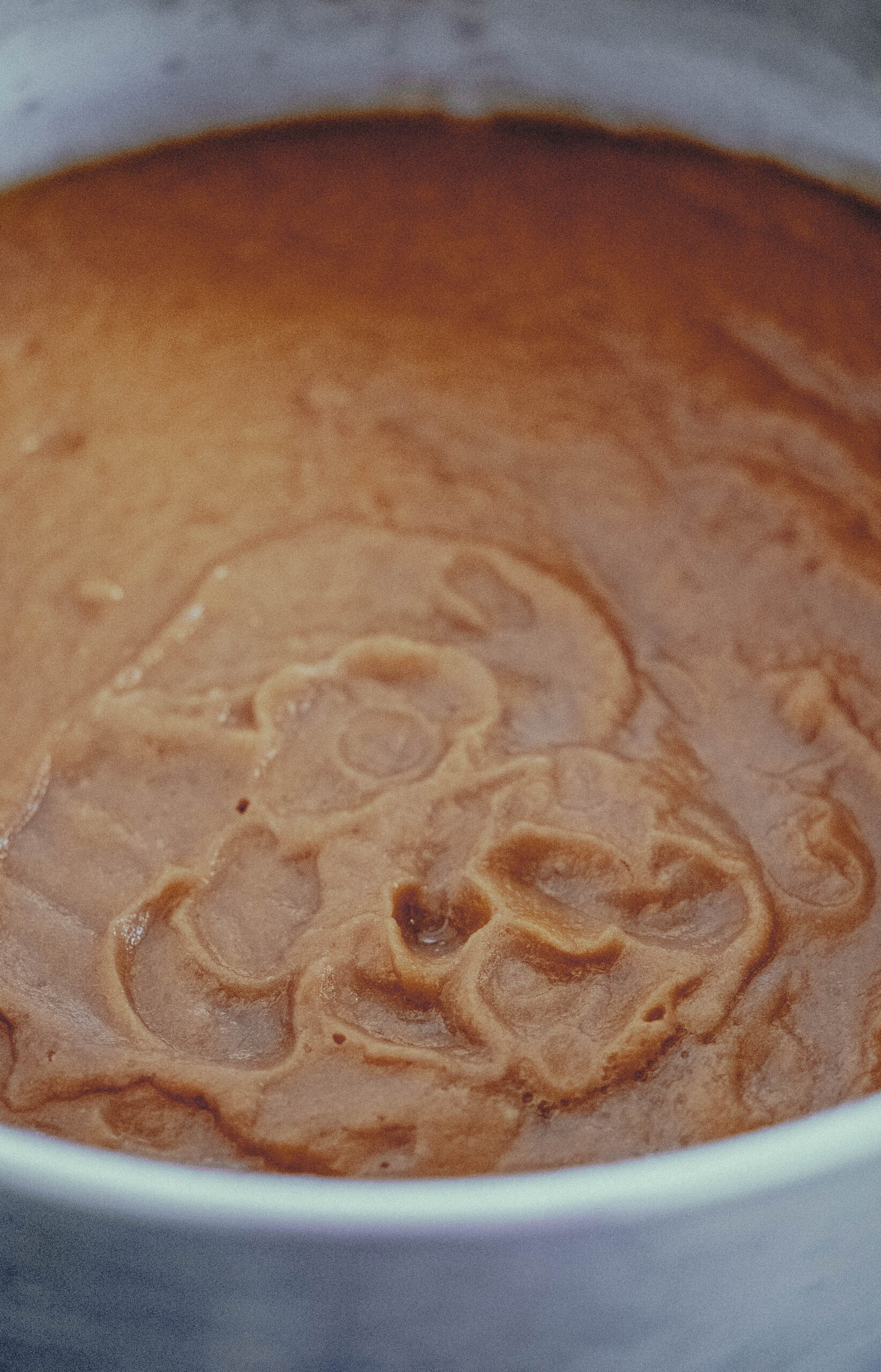 سیبها بهآرامی پخته شده و بدون اضافه کردن آب پوره میشوند.